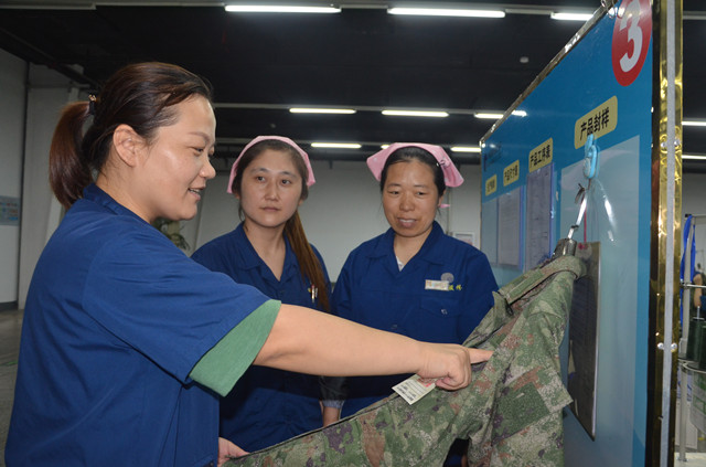 服裝車間員工現(xiàn)場討論推進(jìn)開源節(jié)流和質(zhì)量提升工作