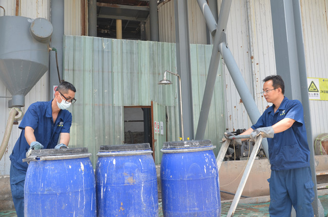員工正在將機(jī)臺回收的花毛,運(yùn)送至水處理