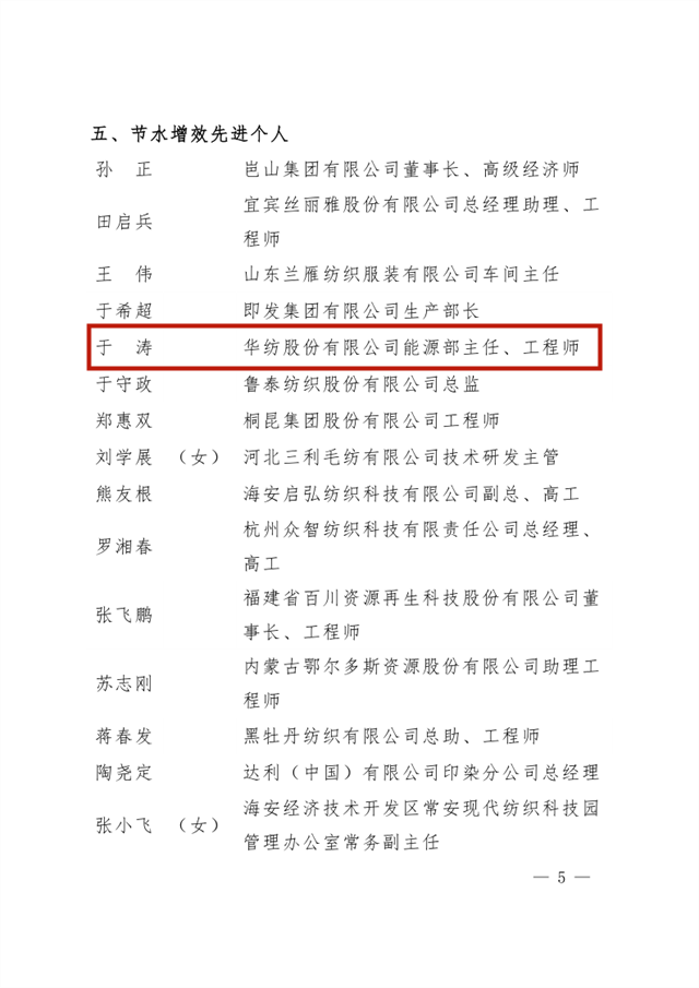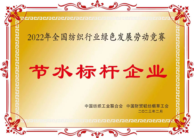 為大力弘揚(yáng)勞模精神、勞動(dòng)精神、工匠精神,組織引導(dǎo)廣大職工為推動(dòng)紡織行業(yè)綠色低碳循環(huán)發(fā)展貢獻(xiàn)智慧和力量。2022年,中國紡織工業(yè)聯(lián)合會(huì)與中國財(cái)貿(mào)輕紡煙草工會(huì)組織開展了涉及節(jié)水增效、節(jié)能降碳兩個(gè)領(lǐng)域的全國紡織行業(yè)綠色發(fā)展勞動(dòng)競賽。在近日公布的競賽結(jié)果的通報(bào)中,公司獲評“節(jié)水標(biāo)桿企業(yè)”榮譽(yù)稱號、公司系統(tǒng)工程部能源副總工于濤榮獲“節(jié)水增效先進(jìn)個(gè)人”榮譽(yù)稱號。