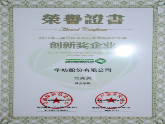 日前,由中國(guó)紡織工業(yè)聯(lián)合會(huì)主辦的中國(guó)國(guó)際面料設(shè)計(jì)大賽、中國(guó)生態(tài)環(huán)保面料設(shè)計(jì)大賽活動(dòng)圓滿結(jié)束,公司在大賽中取得可喜成績(jī),分別榮獲“2018/2019秋冬中國(guó)流行面料入圍企業(yè)”、“2017第二屆中國(guó)生態(tài)環(huán)保面料創(chuàng)新企業(yè)”榮譽(yù)稱號(hào)。